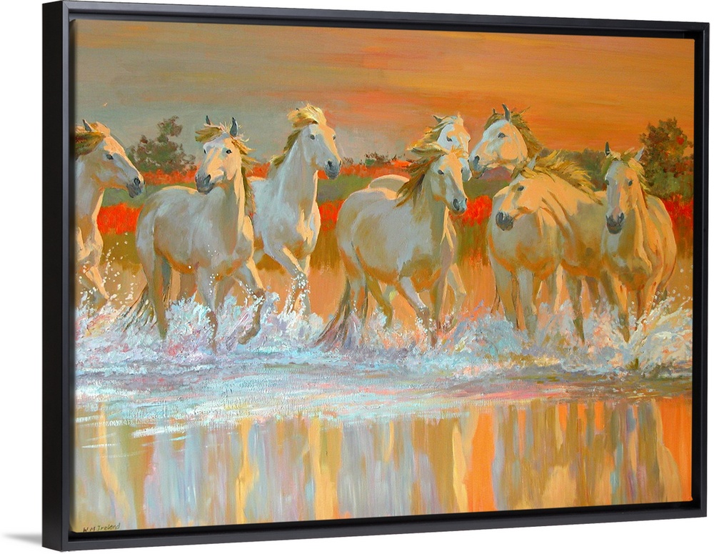 <p>Landscape canvas wall art of wild, white horses galloping through water at sunset.</p>