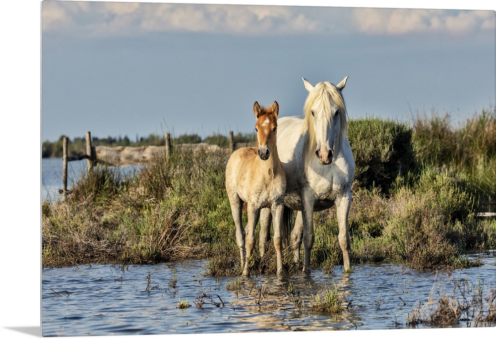 <p>Mother and foal Camargue horse in the south of France.</p>