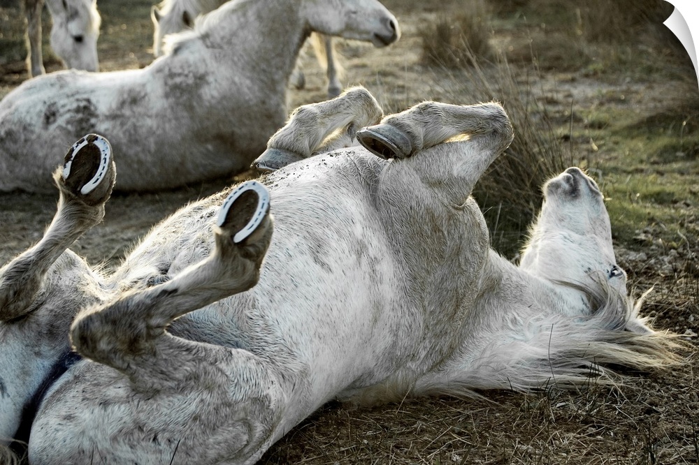 <p>Large, landscape photograph of several Camargue horses on a grassy field, the one in the foreground plays on the ground as he rolls around on his back, in Arles, France.</p>