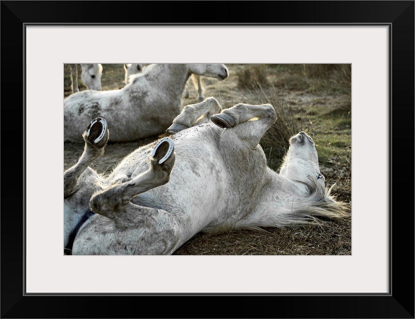 <p>Large, landscape photograph of several Camargue horses on a grassy field, the one in the foreground plays on the ground as he rolls around on his back, in Arles, France.</p>
