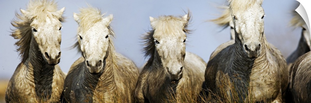 <p>Horizontal photograph of give white horses galloping together as mud splashes up on their white coats.</p>