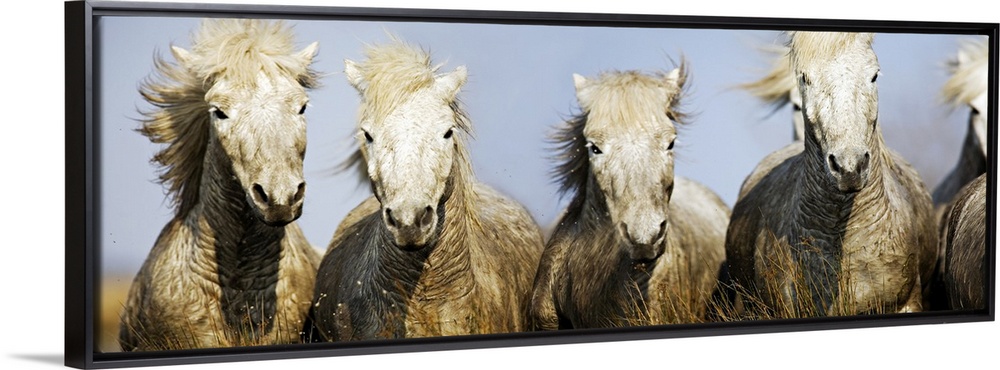 <p>Horizontal photograph of give white horses galloping together as mud splashes up on their white coats.</p>