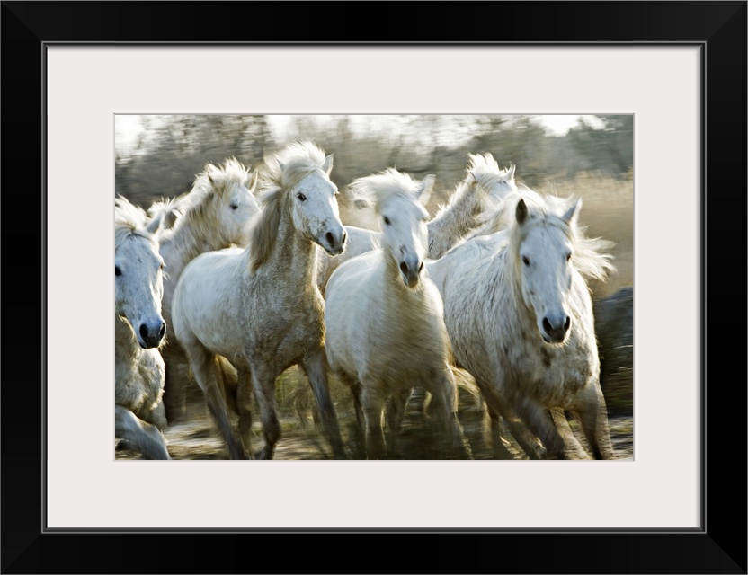 <p>Several white horses gallop through mud in this horizontal photograph.</p>