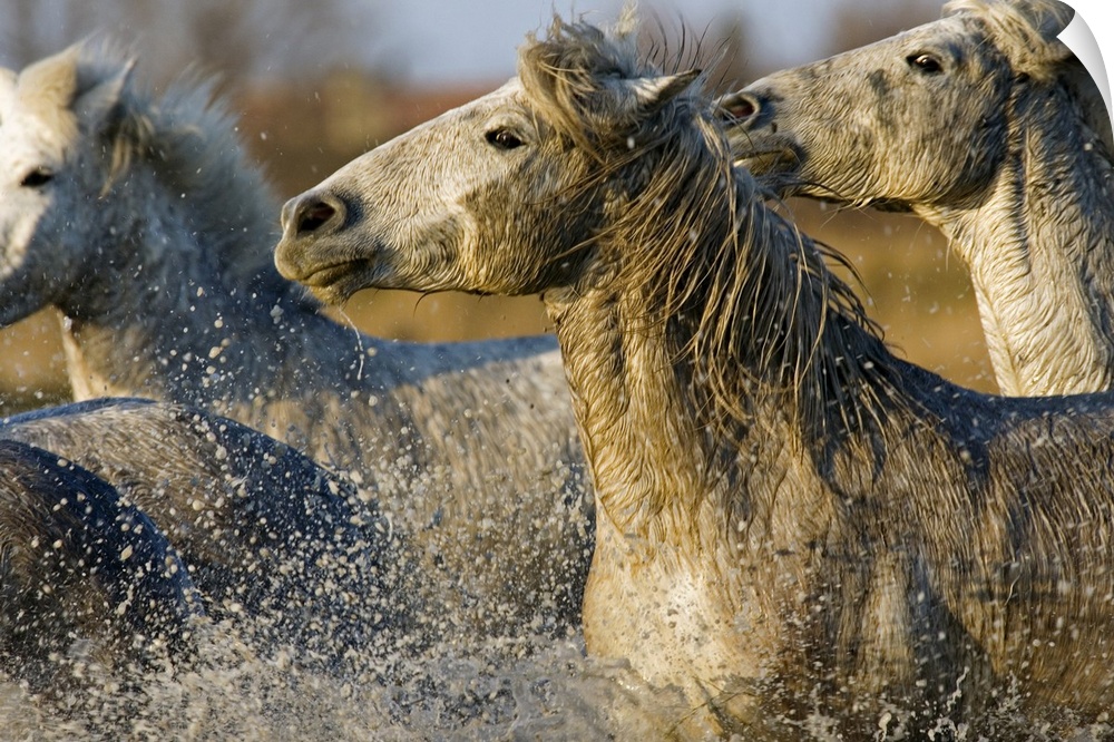 <p>A herd of horses are photographed galloping through water that is splashing up from the bottom of the picture.</p>