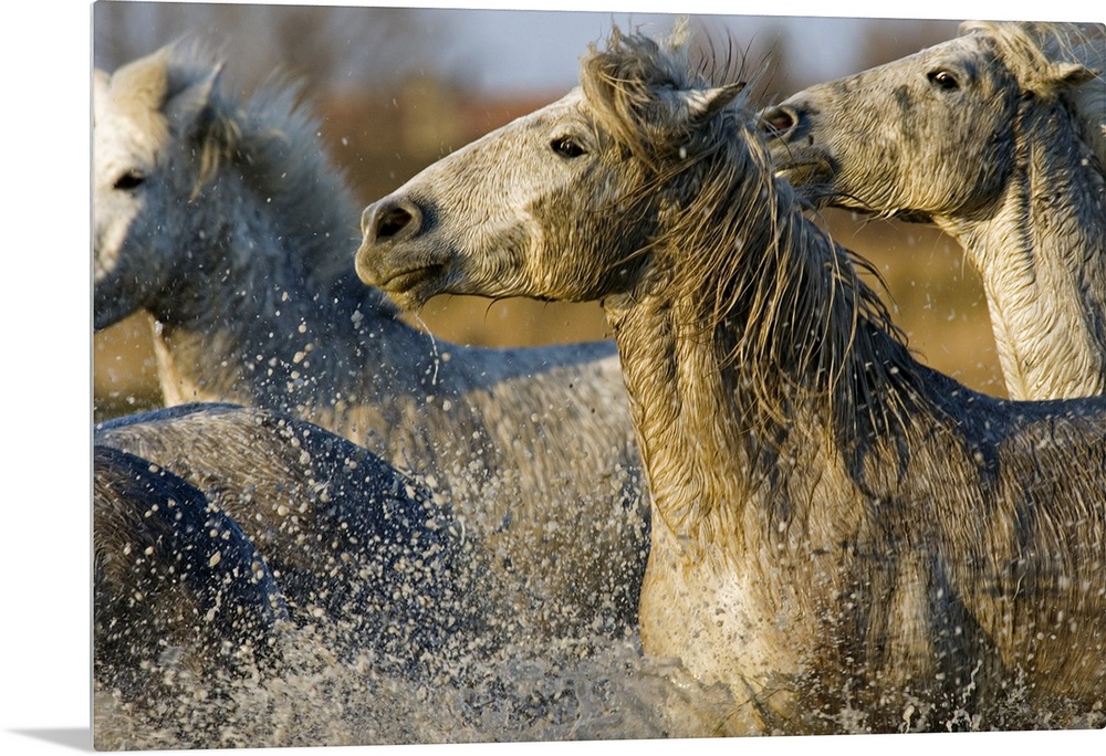 <p>A herd of horses are photographed galloping through water that is splashing up from the bottom of the picture.</p>