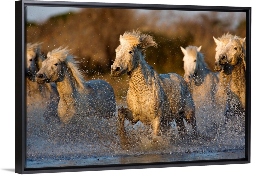 <p>Huge photograph includes six horses as they gallop and splash through a body of water while the sun begins to set. The sharp focus of the horses is contrasted by the softer focus of the background.</p>