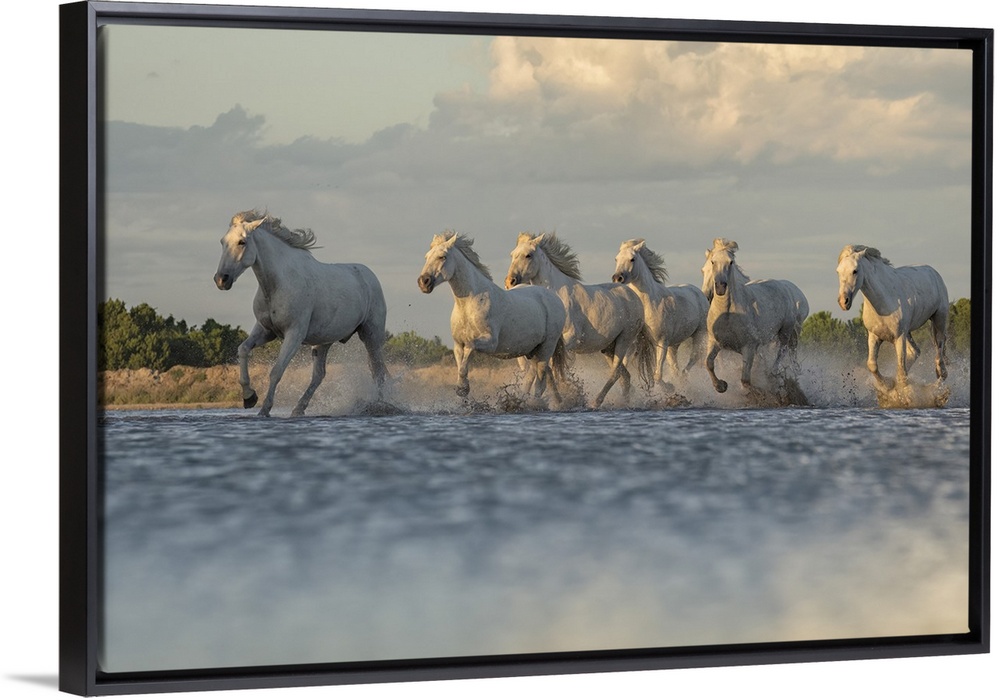 <p>Camargue horses running through the water in the south of France. A fine example of the power in these amazing animals; Saintes-Maries-de-la-Mer, France</p>