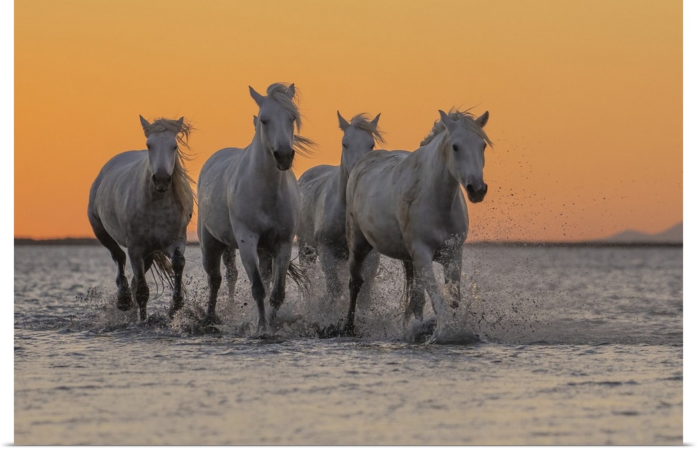 <p>Camargue horses running through the water at sunrise in the south of France. A fine example of the power in these amazing animals; Saintes-Maries-de-la-Mer, France</p>