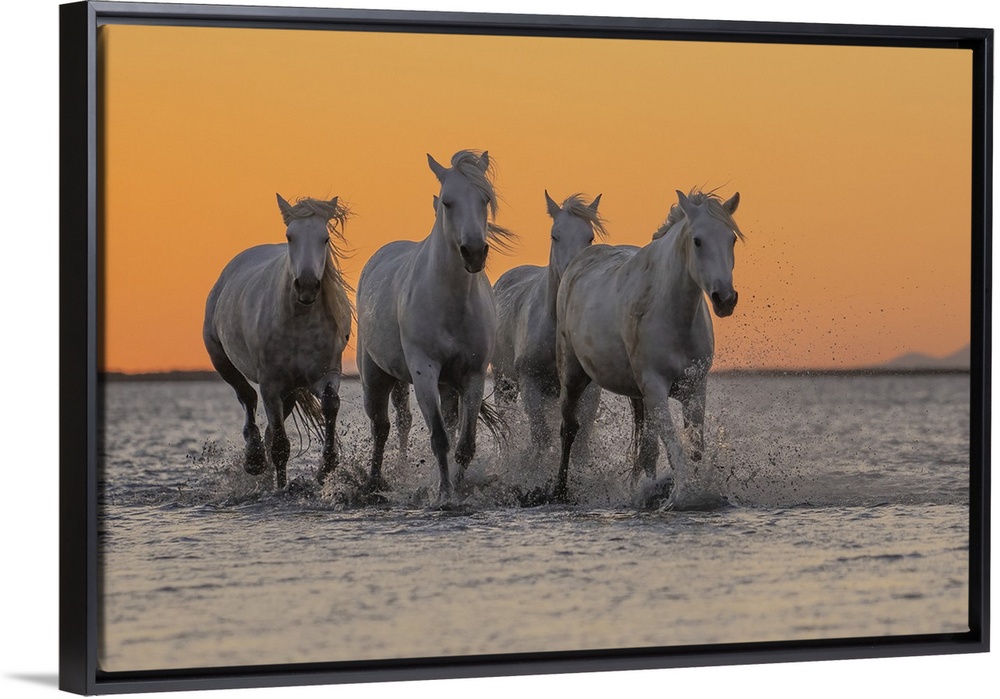 <p>Camargue horses running through the water at sunrise in the south of France. A fine example of the power in these amazing animals; Saintes-Maries-de-la-Mer, France</p>
