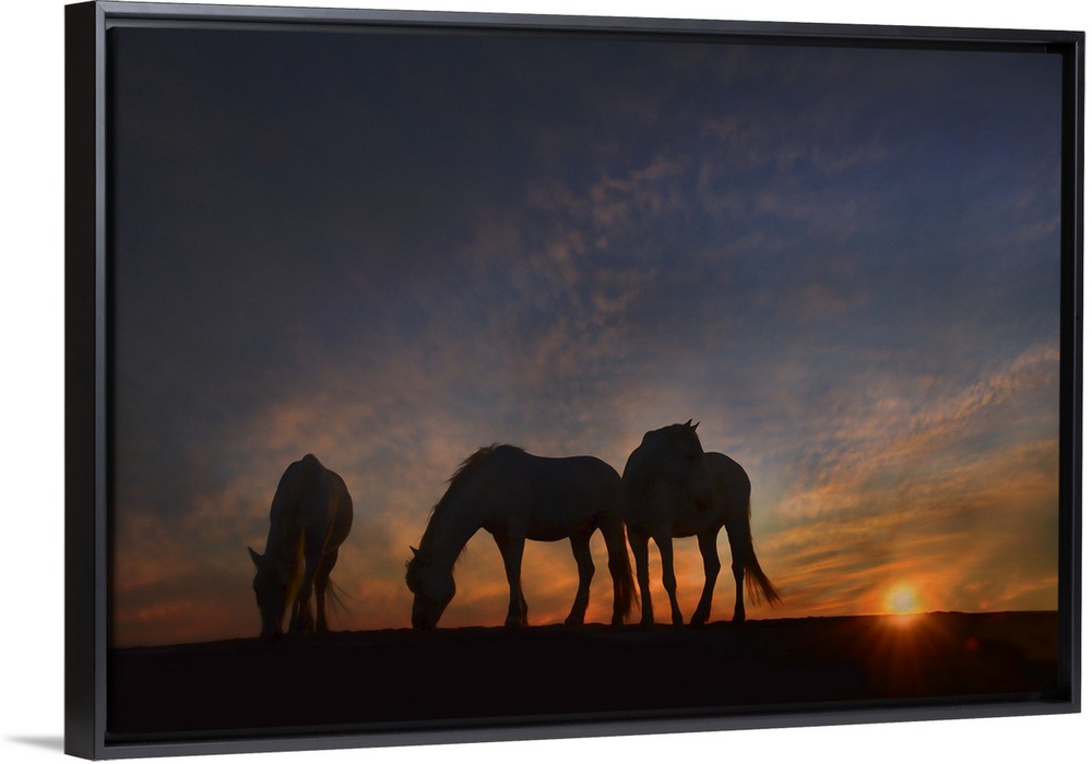 <p>Fine art photo of three silhouetted horses grazing at sunset.</p>