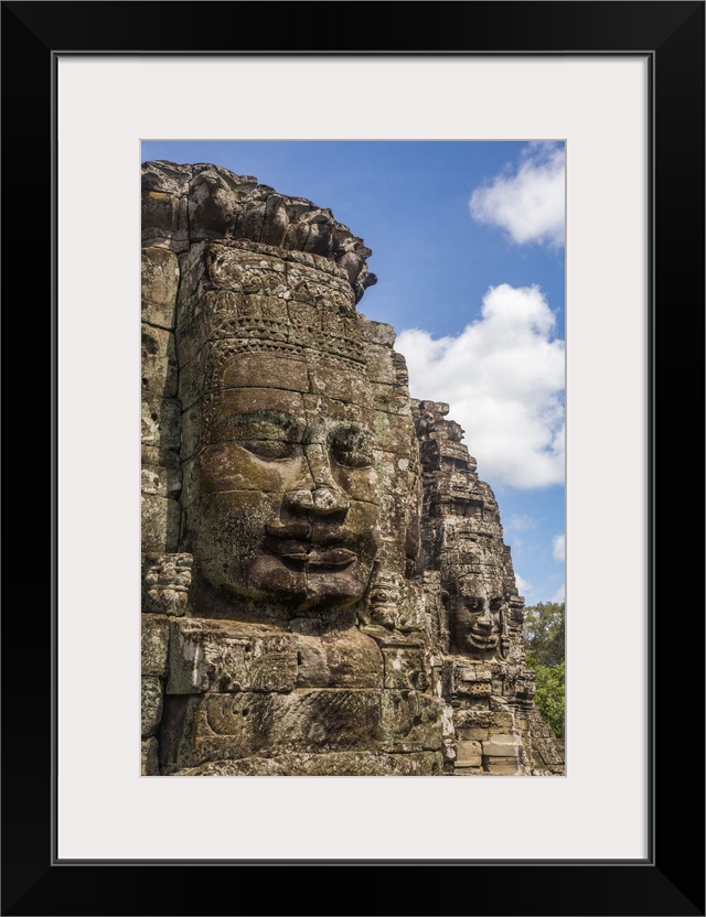 <p>Cambodia, Siem Reap, Angkor, Giant stone faces at the Bayon temple mountain at the UNESCO World Heritage site of Angkor Archeological Park.</p>