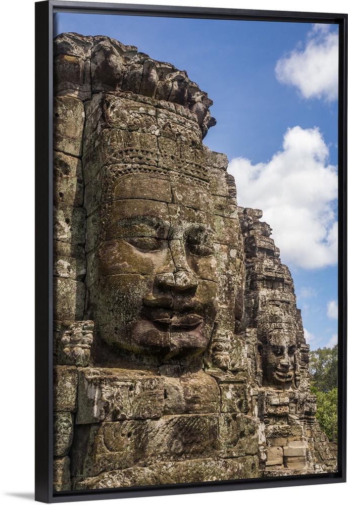 <p>Cambodia, Siem Reap, Angkor, Giant stone faces at the Bayon temple mountain at the UNESCO World Heritage site of Angkor Archeological Park.</p>