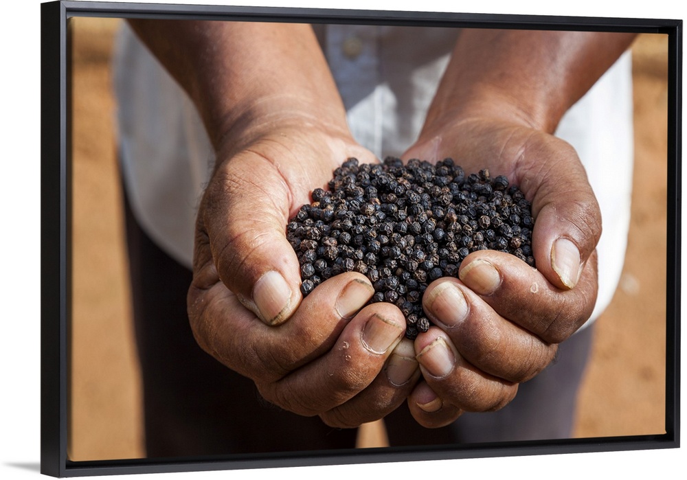 <p>Cambodia, Kampot, Black pepper corns are presented by a worker at a pepper plantation in the highly regarded terroir of Kampot province.</p>