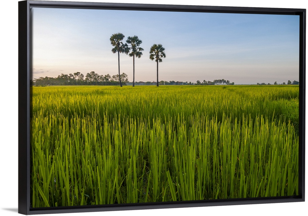 <p>Cambodia, palm trees in a green rice field at sunrise.</p>