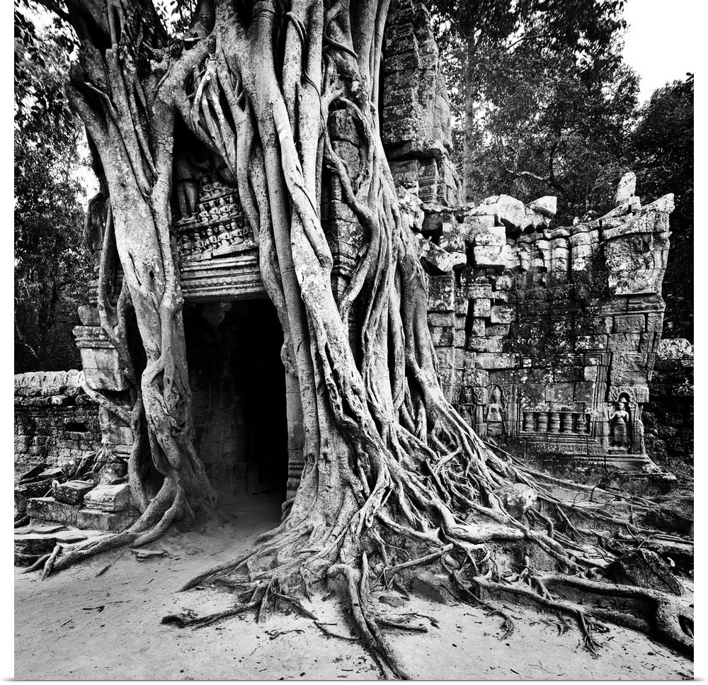 <p>Cambodia, Siem Reap, Angkor, Ta Som temple, giant roots overgrowing on the gopura (entrance gate).</p>
