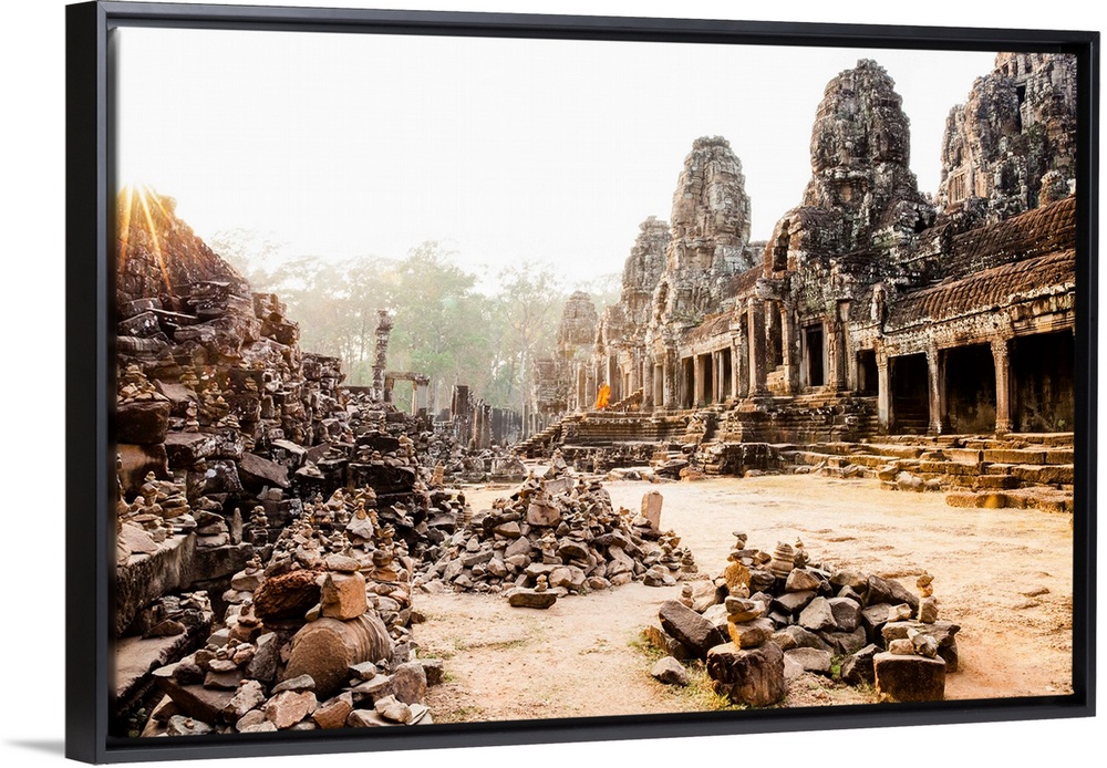 <p>Cambodia, Siemreab, Angkor, Monks leaving the Bayon Temple at sunset.</p>