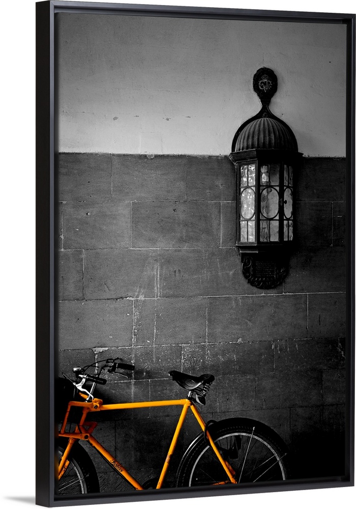 <p>Contemporary photograph of brightly colored bicycle with antique light fixture on brick wall in background.</p>
