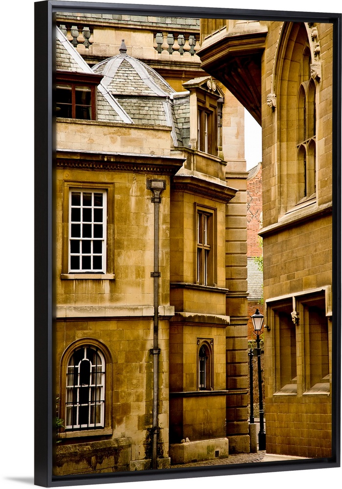 <p>A view of ancient buildings in yellowed stone in Cambridge, England.</p>