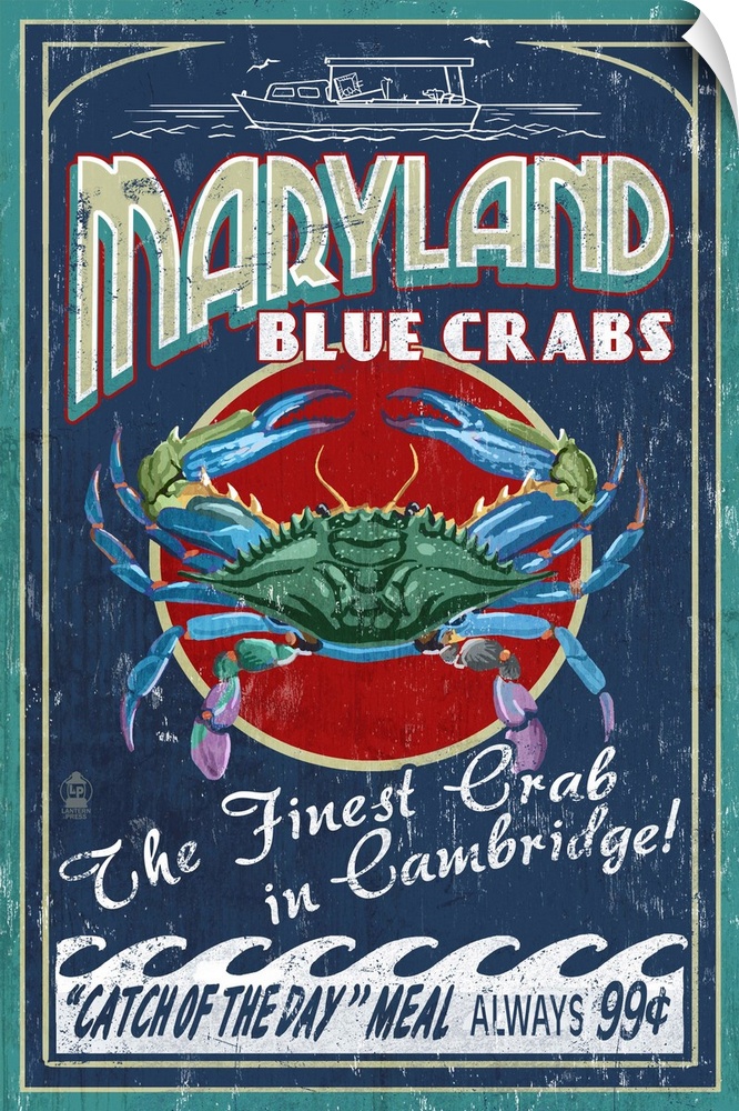 <p>Retro stylized art poster of a vintage seafood market sign displaying a blue crab.</p>