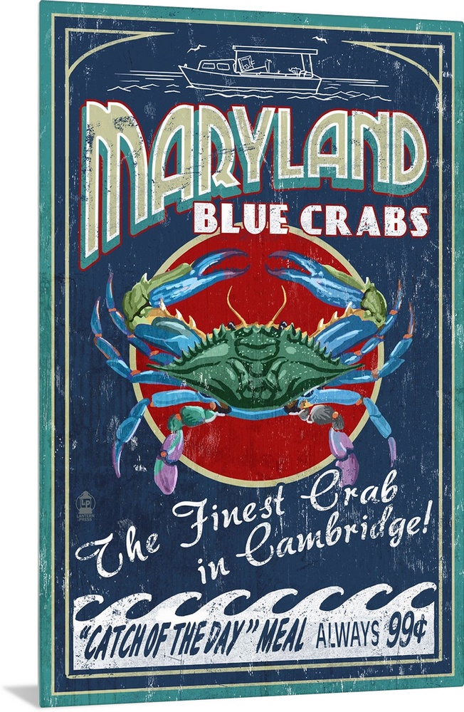 <p>Retro stylized art poster of a vintage seafood market sign displaying a blue crab.</p>