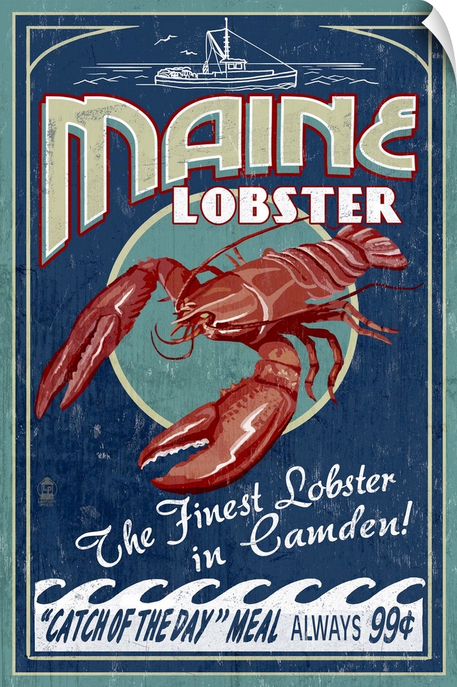 <p>Retro stylized art poster of a vintage seafood market sign displaying a lobster.</p>