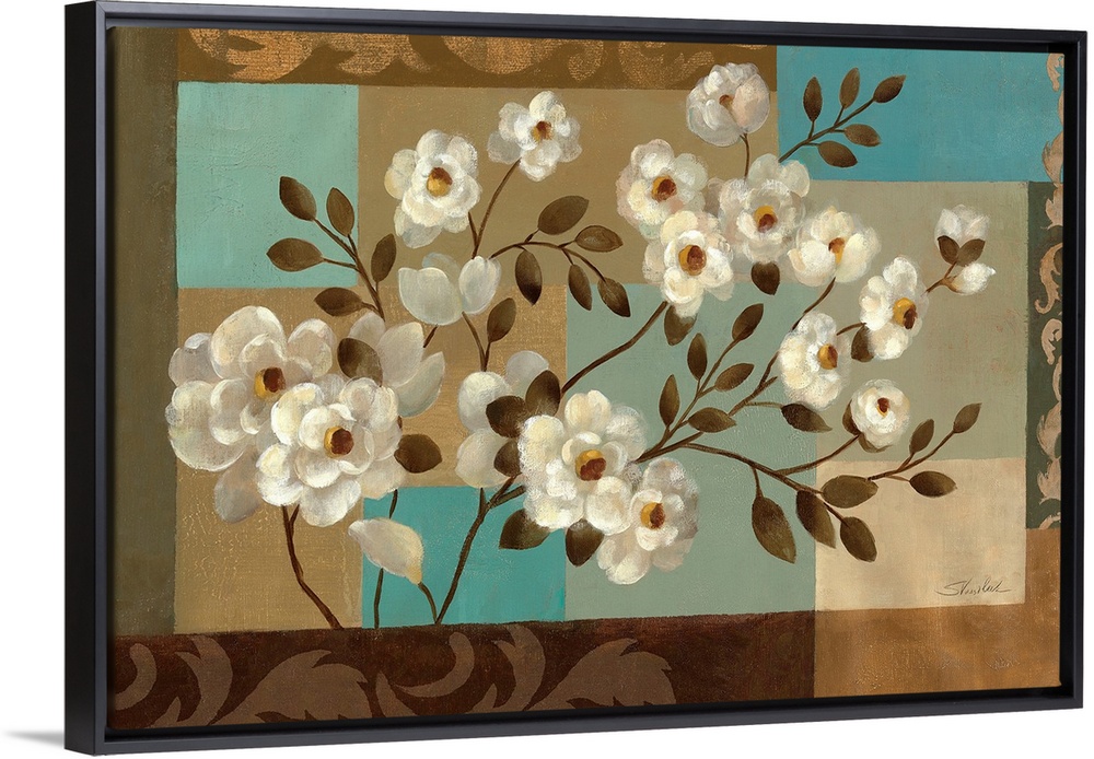 <p>Horizontal, large artwork for a living room or office. A cluster of white flowers with leaves on a collaged background of squares, with scrolling shapes on the outer edges.</p>
