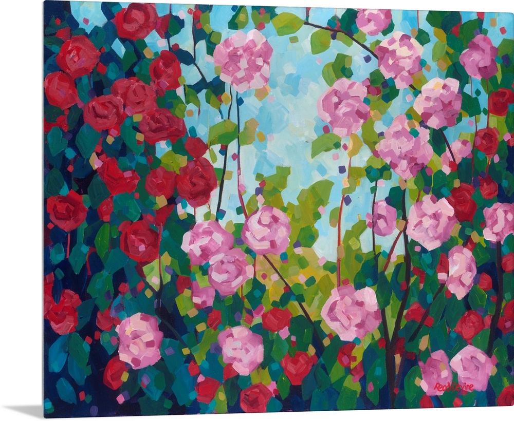 <p>Pink and red camellias in the garden, with square strokes of paint floating in the blue sky.</p>