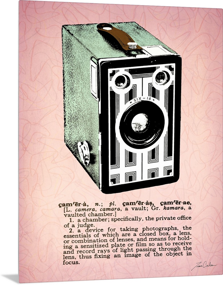 <p>Retro-style illustration of a box camera with the dictionary definition below the image.</p>