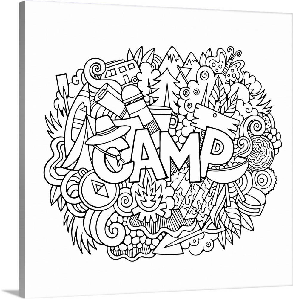 <p>An assortment of camping-themed objects, including trees and maps, surrounding the word "Camp."</p>