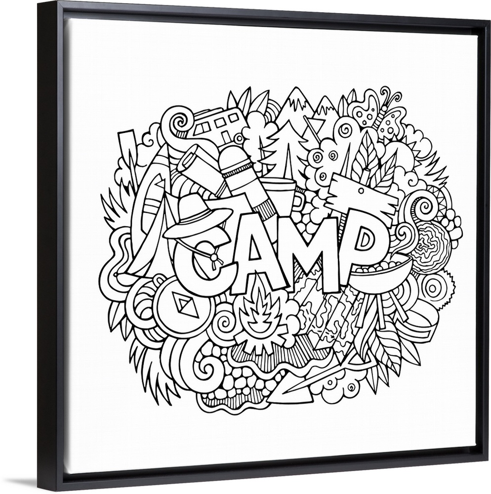<p>An assortment of camping-themed objects, including trees and maps, surrounding the word "Camp."</p>