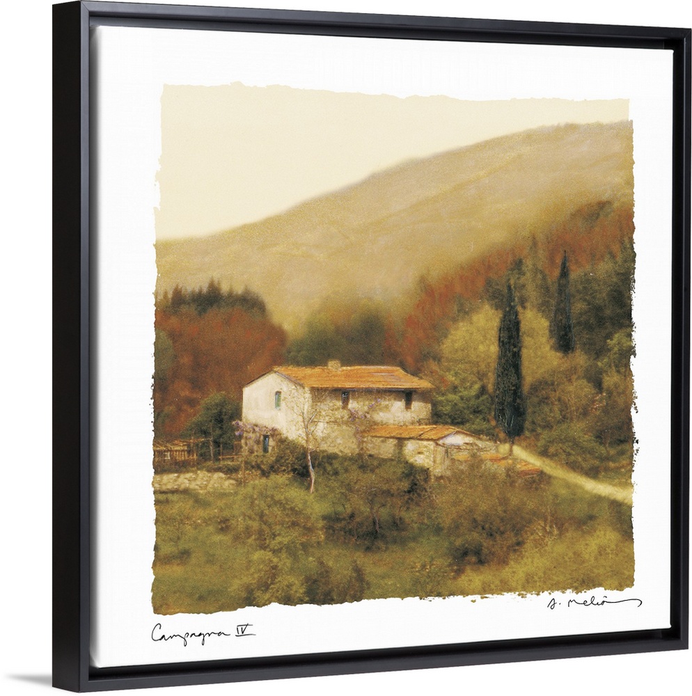 <p>A large painting of a white cottage home sitting in the countryside surrounded by trees with big hills in the background.</p>