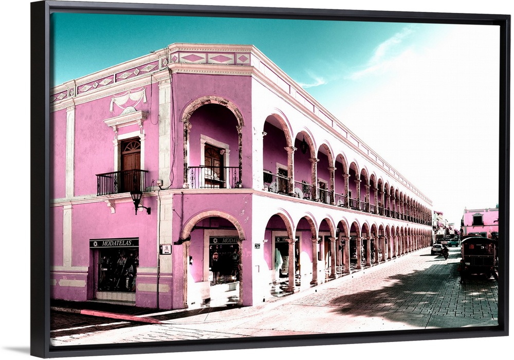 <p>Photograph of a street view in Campeche, Mexico with pink architecture. From the Viva Mexico Collection.</p>