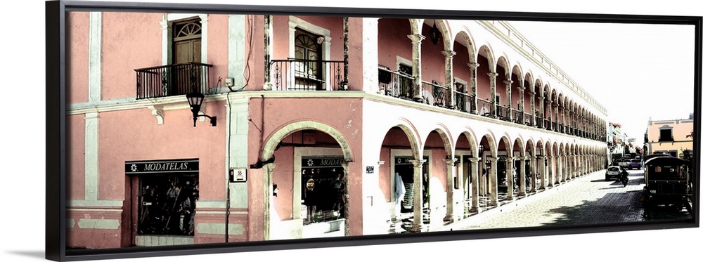 <p>Washed out panoramic photograph of a streetscape in Campeche, Mexico, with pink architecture. From the Viva Mexico Panoramic Collection.</p>