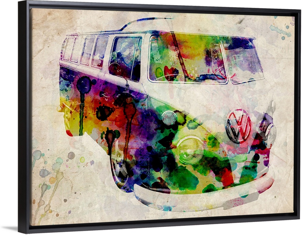 <p>Watercolor and digital composite of a VW camper van on a neutral background with splashes and drips on the painting.</p>