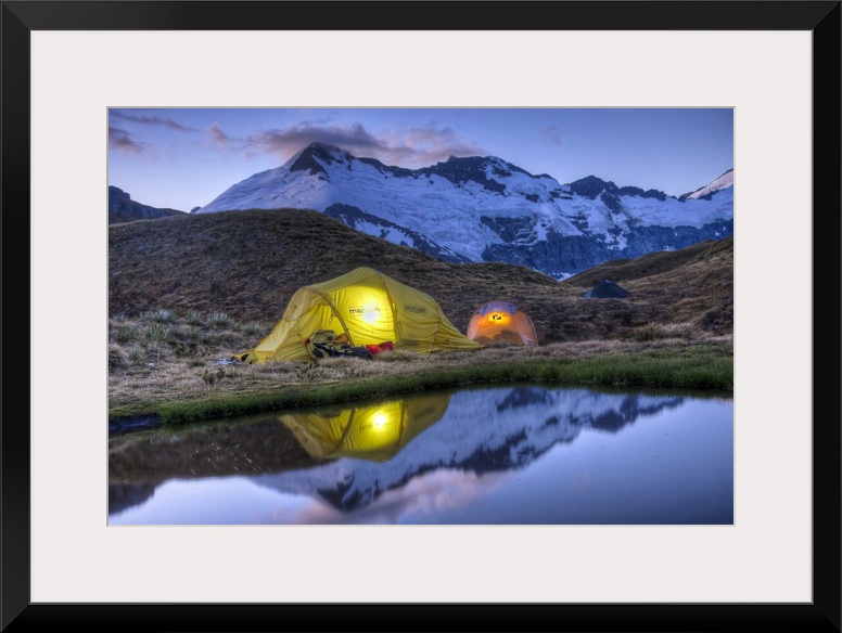 <p>Campers read in tents lit by flashlight, Cascade Saddle, Mount Aspiring National Park, New Zealand</p>