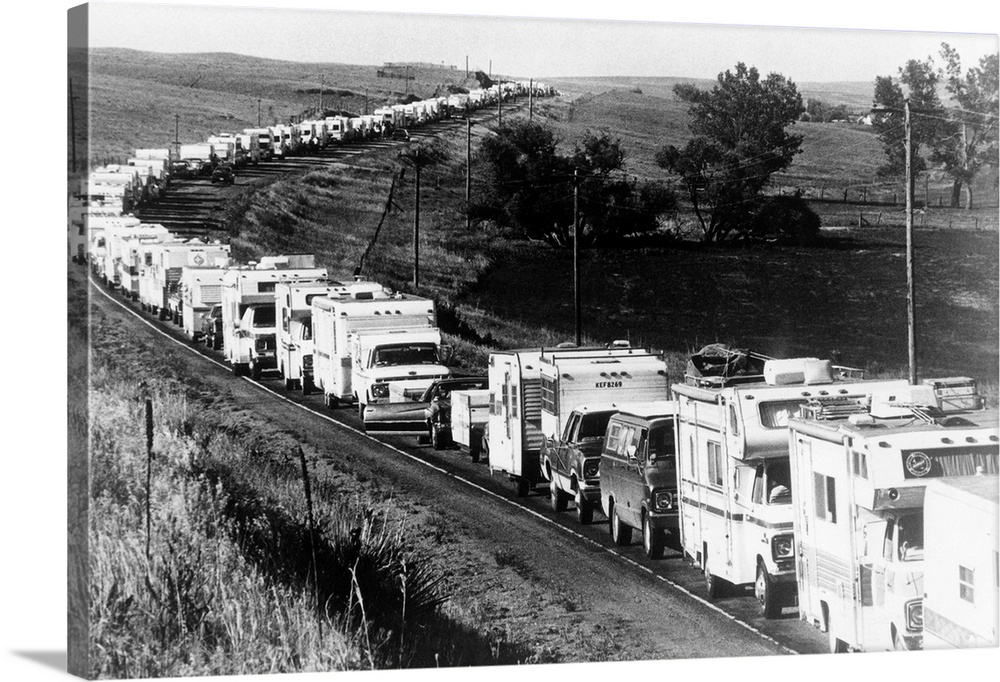<p>7/1978- Elbert, CO- Hundreds of recreational vehicles are lined up along a county road while awaiting entry into the Eighteenth Annual Campers and Hikers Association Campvention. The get-together was being held at the Peaceful Valley Boy Scout Ranch south of Elbert. More than 30,000 people and 7,000 recreational vehicles were expected for the week-long affair that was to end July 13. BPA2</p>