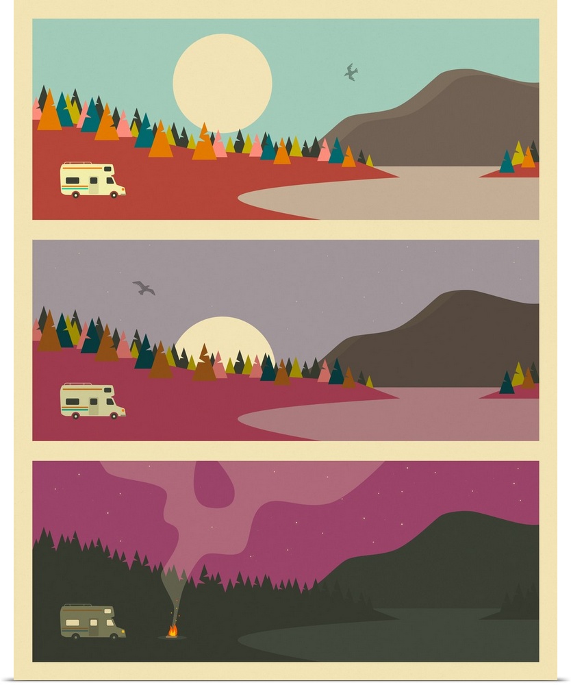 <p>Retro style illustration of caravan camping in the woods split into three sections throughout the day, ending with a campfire.</p>