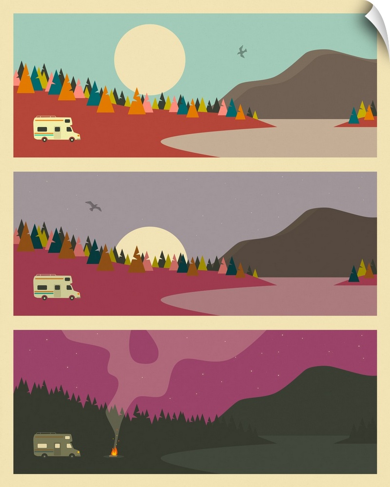 <p>Retro style illustration of caravan camping in the woods split into three sections throughout the day, ending with a campfire.</p>