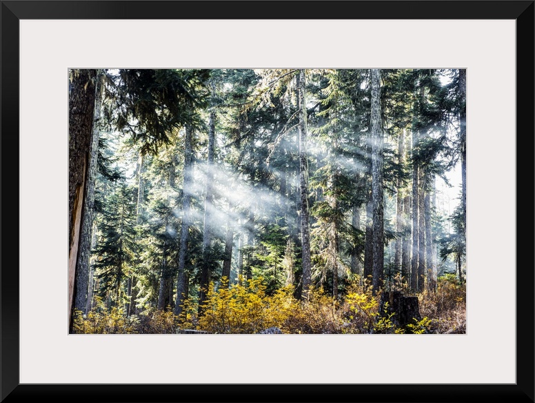 <p>Campfire smoke drifting through the trees on an autumn morning, Gifford Pinchot National Forest; Washington, United States of America</p>