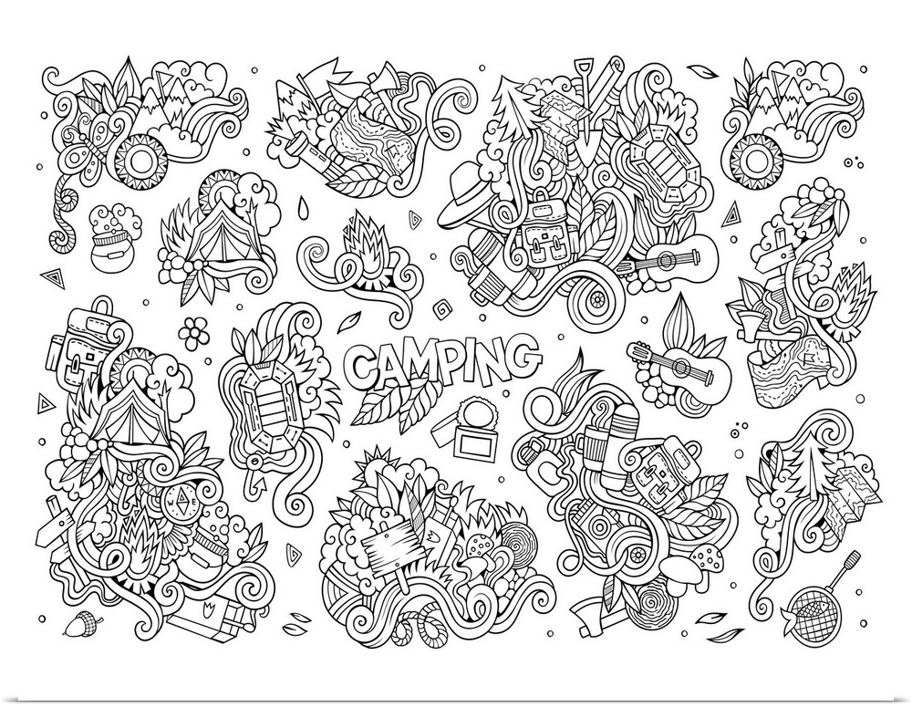 <p>An assortment of camping-themed objects, including backpacks and trees, surrounding the word "Camping."</p>