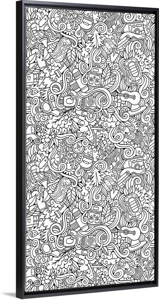 <p>An assortment of camping-themed objects, including backpacks, trees, and maps.</p>