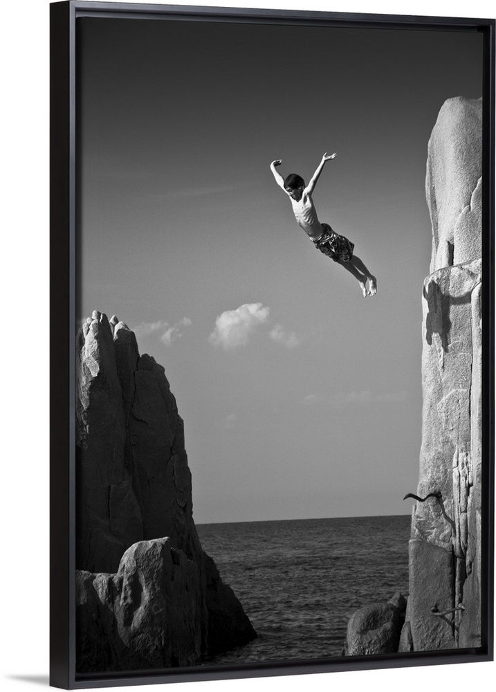 <p>A young man leaping off a cliff into the ocean, Sardinia, Italy.</p>