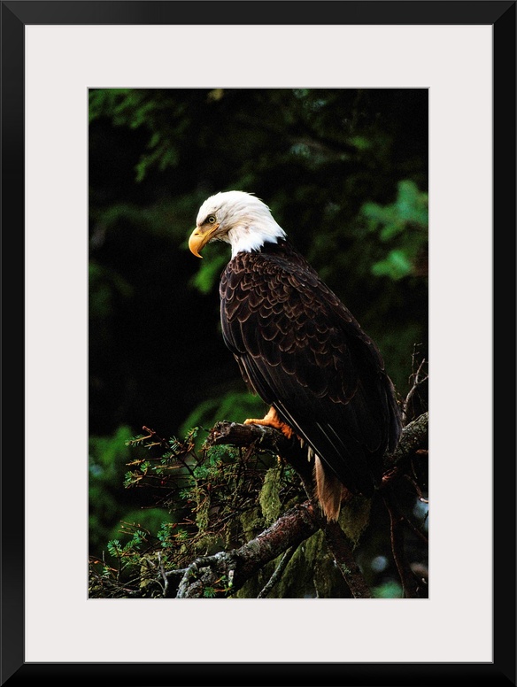 <p>Majestic-looking American bald eagle (HALIAEETUS LEUCOCEPHALUS) perched in tree .</p>