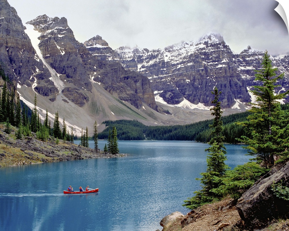 <p>Canada, Alberta, Moraine Lake. A canoe glides across beautiful Moraine Lake in the Valley of the Ten Peaks, Banff NP, a World Heritage Site, Alberta, Canada.</p>