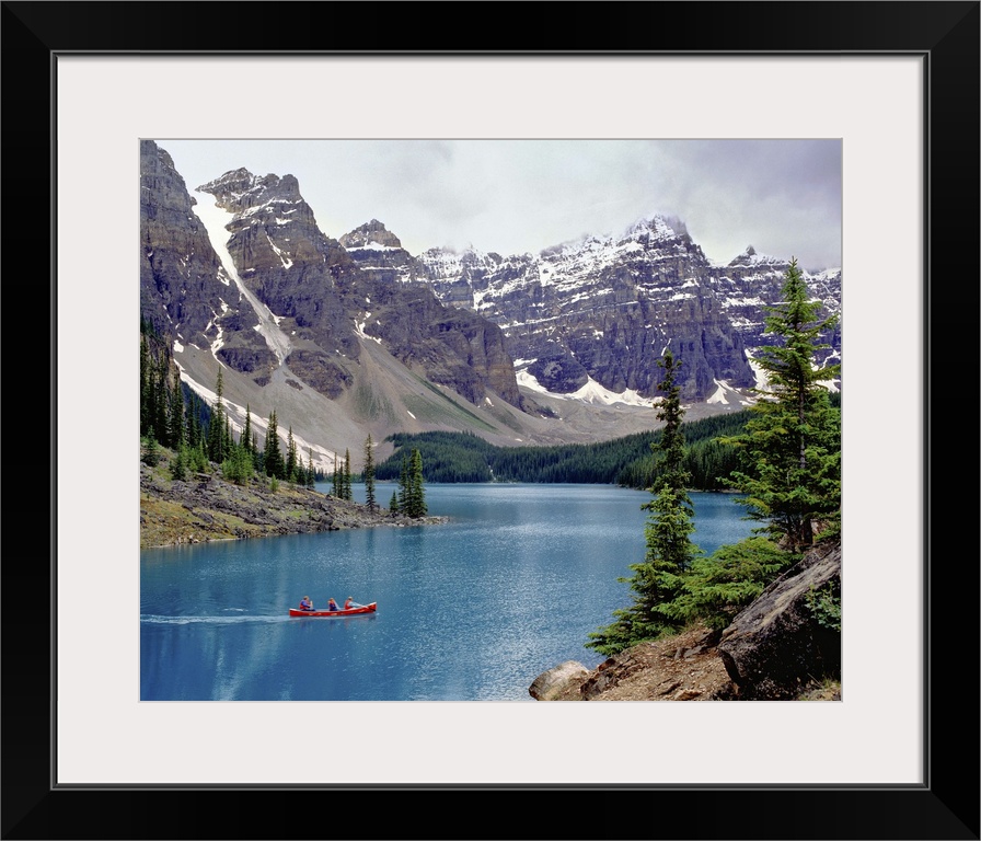 <p>Canada, Alberta, Moraine Lake. A canoe glides across beautiful Moraine Lake in the Valley of the Ten Peaks, Banff NP, a World Heritage Site, Alberta, Canada.</p>