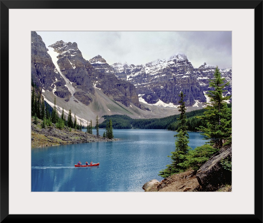 <p>Canada, Alberta, Moraine Lake. A canoe glides across beautiful Moraine Lake in the Valley of the Ten Peaks, Banff NP, a World Heritage Site, Alberta, Canada.</p>