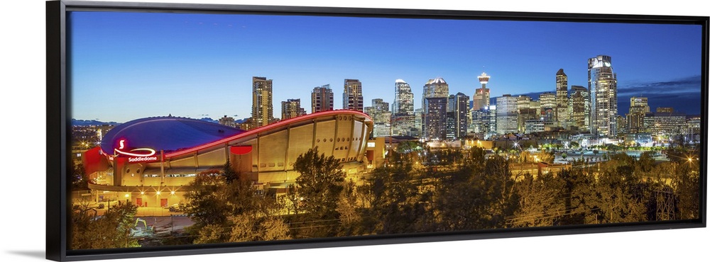<p>Canada, Alberta, Calgary, Skyline of downtown Calgary and Saddledome illuminated at dusk.</p>