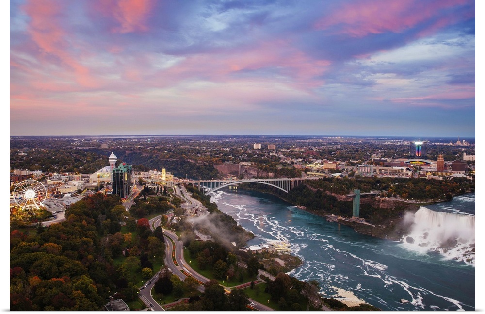<p>Canada and USA, Ontario and New York State, Niagara, Niagara Falls, View over Victoria Park towards Rainbow Bridge and The American Falls</p>