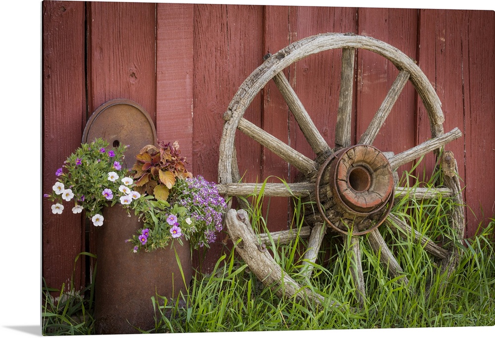 <p>Canada, British Columbia, Cache Creek, Hat Creek Ranch. Vintage wagon wheel and flowers.</p>