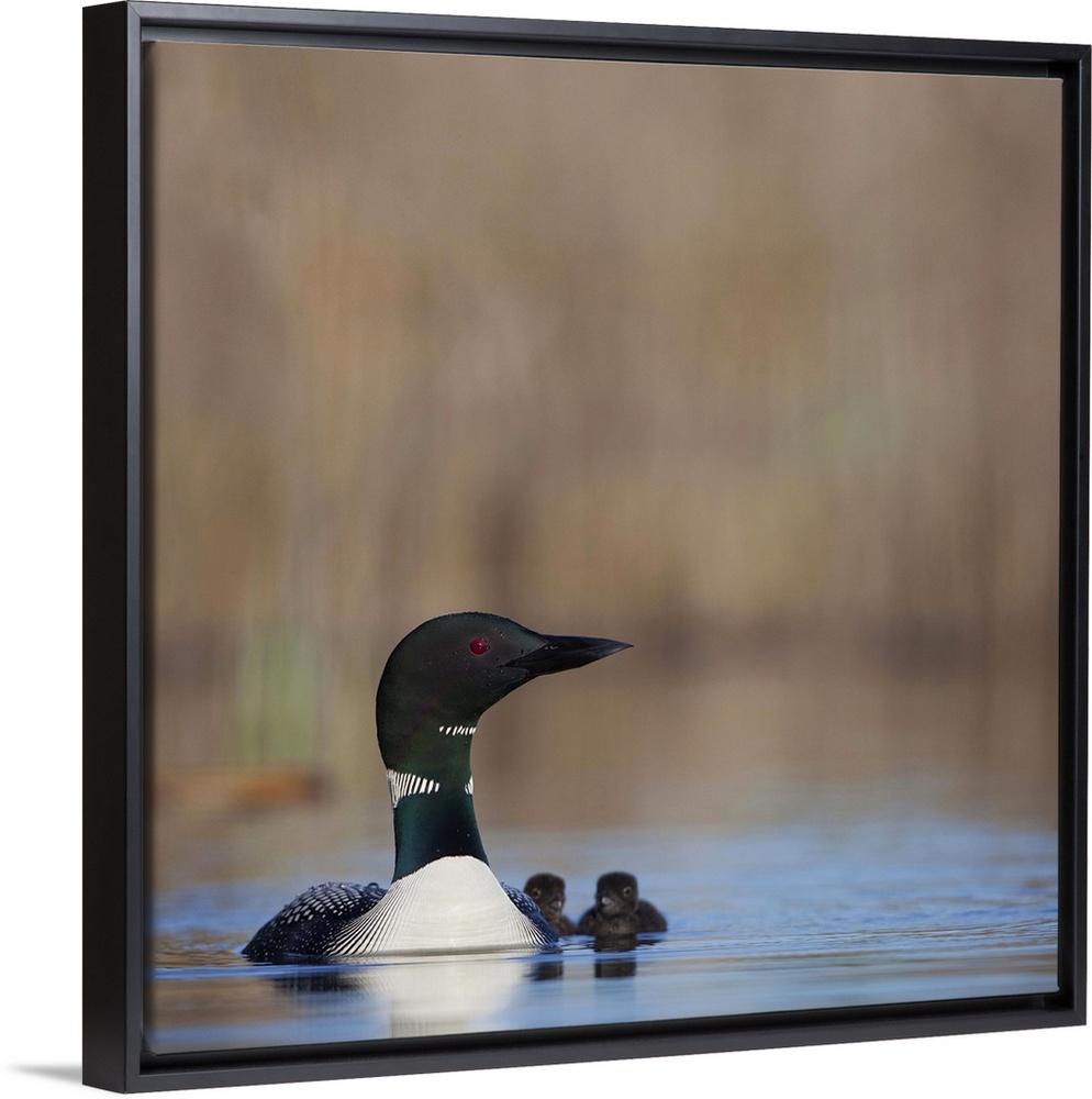 <p>Canada, British Columbia. Common Loon (Gavia Immer) adult female and two-day old chicks on Lac Le Jeune.</p>